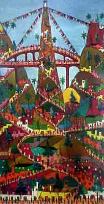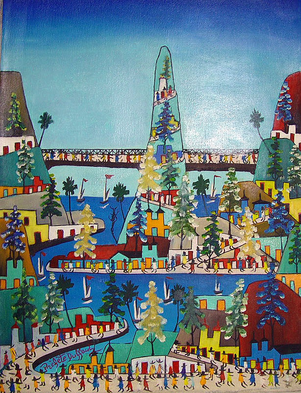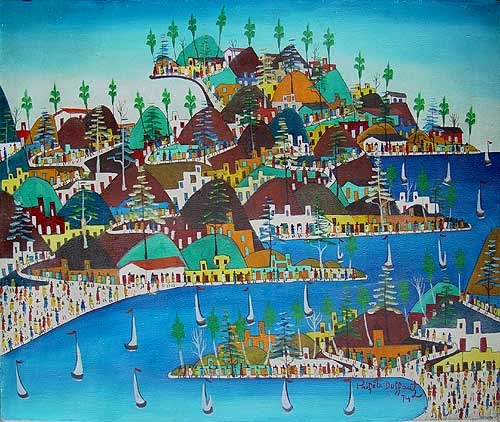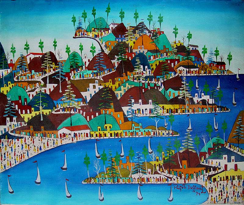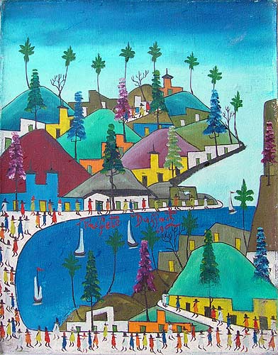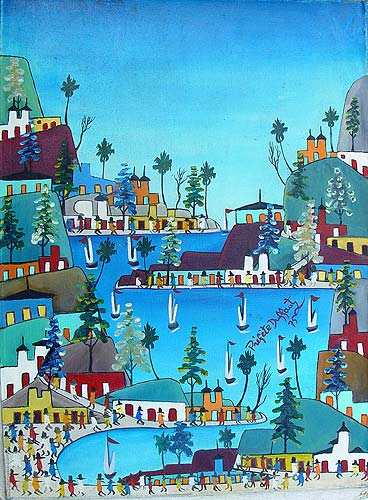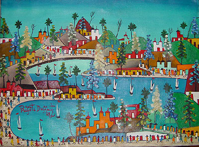 | Born in jacmel on January 1st, 1923, Prefete was an unhappy child who took to draw at an early age. He joined the Centre D'Art in 1948 giving up assisting his sailboat-building father. Renowned for his mountainous landscapes with serpentine roads, Prefete Duffaut is often called a "primitive" painter; others refer to him as "naive". His mural at the Holy Trinity Cathedral in Port-au-prince is a vivid testimony of his enormous talent. Jackie Kennedy Onassis was a collector of Duffaut's paintings. His work is part of several major museums permanent collections all over the world including THE Museum Of Modern Art in New York and The Museum of Modern Art in Brooklyn. Prefete Duffaut is a "must have" to any serious Haitian art collector. |